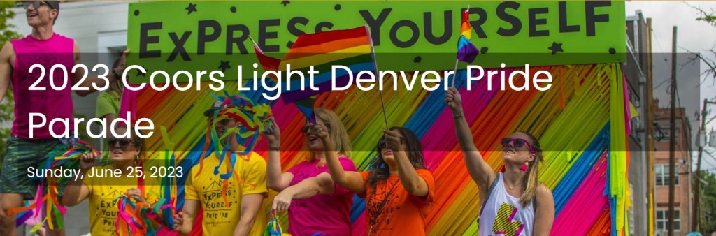 “Join 100,000 or so of your closest friends to cheer on colorful floats, marchers, music, and much more! Join us Sunday, June 25, 2023 beginning at 9:30 am for the Coors Light Denver Pride Parade! The Parade spans 14 blocks of Colfax Avenue from Cheesman Park to Civic Center, where the celebrations continue at day two of Denver PrideFest.”
